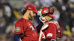 [OSEN=잠실 ,백승철 기자] 30일 오후 서울 잠실구장에서 열린 '2013 한국야쿠르트 세븐 프로야구' 두산 베어스와 KIA 타이거즈의 경기 8회말 2사 1,2루 대타 민병헌을 삼진으로 처리한 앤서니가 서재응과 함께 미소지으며 덕아웃으로