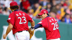 [OSEN=창원, 지형준 기자] 1일 오후 창원 마산구장에서 열린 '2013 한국야쿠트르 세븐 프로야구' NC 다이노스와 LG 트윈스의 경기, 1회말 타점을 올린 이호준이 득점을 올린 김종호와 주먹을 맞대고 있다. 이날 NC는 사이드암투수 이