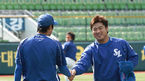 [OSEN=대구, 곽영래 기자] 1일 오후 대구구장에서 열리는 '2013 한국야쿠르트 세븐 프로야구' 삼성 라이온즈와 넥센 히어로즈의 경기에 앞서 삼성 박석민이 윤성환가 악수를 나누며 이야기를 하고 있다. 삼성 라이온즈 투수 장원