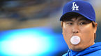 [OSEN=로스앤젤레스,곽영래 기자] 2일(이하 한국시간) 미국 캘리포니아 로스앤젤레스 다저스타디움에서 LA 다저스와 콜로라도 록키츠의 경기가 열렸다. 류현진이 경기 시작 직전 동료들을 바라보며 풍선껌을 불고 있다. 류현진