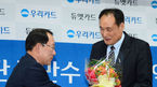 [OSEN=백승철 기자] 2일 오전 서울 종로구 중학동 우리카드 본사에서 열린 우리카드 프로배구단 신임감독 취임식에서 강만수 감독이 정현진 구단주로부터 꽃다발을 받고 있다. 우리카드는 지난 30일 강만수 경기운영위원장을 감
