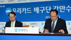 [OSEN=백승철 기자] 2일 오전 서울 종로구 중학동 우리카드 본사에서 열린 우리카드 프로배구단 신임감독 취임식에서 정현진 구단주와 강만수 감독이 계약서에 사인을 하고 있다. 우리카드는 지난 30일 강만수 경기운영위원장을