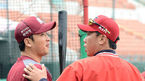 [OSEN=잠실, 이대선 기자] 3일 오후 서울 잠실야구장에서 열린 2013 한국야쿠르트 세븐프로야구 두산 베어스와 LG 트윈스의 경기, 경기에 앞서 두산 김진욱 감독이 훈련 중인 선수들을 바라보고 있다. 두산 베어스는 투수진 맏형 ‘