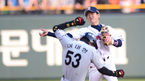[OSEN=잠실, 김영민 기자] 4일 오후 잠실구장에서 열린 '2013 한국야쿠르트 세븐 프로야구'LG 트윈스와 두산 베어스 경기,4회초 수비를 마친 유희관이 호수비를 펼쳐줬던 임재철에게 감사의 인사를 전하고 있다. LG는 사이드암투수