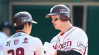 [OSEN=잠실, 이대선 기자] 5일 오후 서울 잠실야구장에서 열린 2013 한국야쿠르트 세븐프로야구 두산 베어스와 LG 트윈스의 경기, 6회말 2사 만루에서 두산 손시헌의 좌전 3타점 적시 3루타 때 홈을 밟은 홍성흔이 덕아웃에서 동료