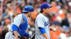 [OSEN=샌프란시스코,곽영래 기자] 6일(이하 한국시간) 미국 샌프란시스코 AT&T 파크에서 열린 '2013 메이저리그' 샌프란시스코 자이언츠와 LA 다저스의 경기 엘리스 포수가 1실점 후 마운드에 올라 류현진을 진정시키고 있다. 류