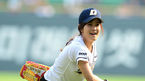 [OSEN=잠실, 지형준 기자] 12일 오후 서울 잠실구장에서 열린 2013 한국야쿠르트 세븐프로야구 두산 베어스와 NC 다이노스의 경기, 경기에 앞서 개그우먼 김지민이 시구를 하고 있다. NC는 외국인 우완 찰리 쉬렉을 선발로 내세웠다