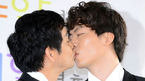 [OSEN=정송이 기자] 영화 제작자 겸 감독인 김조광수가 15일 오후 서울 동작구 아트나인 야외무대에서 동성연인과 결혼식 기자회견을 가졌다. 김조광수와 그의 동성 파트너가 키스를 나누고 있다. 동성연인은 김조광수 감독보다