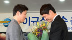 [OSEN=백승철 기자] 이규섭이 15일 오전 서울 논현동 KBL센터에서 은퇴 기자회견에서 이규섭이 조성민으로부터 꽃다발을 받고 있다. 서울 삼성 썬더스 농구단의 베테랑 포워드 이규섭이 은퇴를 결정했다. 은퇴 후에는 구단의 지원