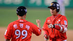 [OSEN=광주,박준형 기자] 16일 오후 광주 무등구장에서 열린 '2013 한국야쿠르트 세븐 프로야구' KIA 타이거즈와 SK 와이번스의 경기 7회초 1사 2루 SK 최정이 1타점 적시타를 날리고 정경배 코치와 하이파이브를 하고 있다. KIA 윤석민