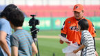 [OSEN=광주, 이대선 기자] 23일 오후 광주 무등야구장에서 열린 '2013 한국야쿠르트 세븐 프로야구' KIA 타이거즈와 한화 이글스의 경기, 경기에 앞서 한화 김태균이 방송 인터뷰를 하고 있다. 한화는 좌완 투수 송창현을 선발로 내