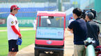 [OSEN=광주, 이대선 기자] 23일 오후 광주 무등야구장에서 열린 '2013 한국야쿠르트 세븐 프로야구' KIA 타이거즈와 한화 이글스의 경기, 경기에 앞서 KIA 신승현이 방송 인터뷰를 하고 있다. 한화는 좌완 투수 송창현을 선발로 내세