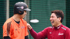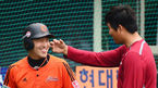 [OSEN=목동, 민경훈 기자] 26일 오후 서울 목동구장에서 2013 한국야쿠르트 세븐프로야구 넥센 히어로즈와 롯데 자이언츠의 경기가 열릴 예정인 가운데 양팀 훈련 시간에 롯데 넥센 김영민이 손아섭과 즐겁게 얘기를 나누고 있다.