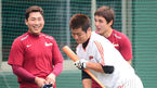 [OSEN=목동, 민경훈 기자] 26일 오후 서울 목동구장에서 2013 한국야쿠르트 세븐프로야구 넥센 히어로즈와 롯데 자이언츠의 경기가 열릴 예정인 가운데 양팀 훈련 시간에 넥센 송신영이 롯데 코치진을 찾아가 환하게 웃고 있다.