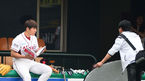 [OSEN=목동, 민경훈 기자] 26일 오후 서울 목동구장에서 2013 한국야쿠르트 세븐프로야구 넥센 히어로즈와 롯데 자이언츠의 경기가 열릴 예정인 가운데 양팀 훈련 시간에 롯데 김대우 뒤에서 넥센 허도환 포수가 엉덩이를 차고 있