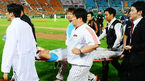 [OSEN=부산, 민경훈 기자] 30일 오후 부산 사직구장에서 열린 2013 한국야쿠르트 세븐프로야구 롯데 자이언츠와 두산 베어스의 경기에서 9회초 선두타자두산 홍성흔의 타구를 잡다가 쓰러진 롯데 2루수 정훈이 들것에 실려가고 있