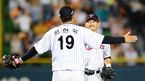 [OSEN=잠실, 이대선 기자] 7일 오후 잠실야구장에서 열린 '2013 한국야쿠르트 세븐 프로야구' LG 트윈스와 롯데 자이언츠의 경기, 8회초 무사 만루에서 LG 박용택이 롯데 강민호의 타구를 외야플라이로 처리하고 투수 정현욱과 포옹