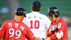 [OSEN=잠실, 민경훈 기자] 11일 오후 서울 잠실구장에서 열린 2013 한국야쿠르트 세븐프로야구 두산 베어스와 SK 와이번스의 경기, 3회말 1사 주자 3루 두산 김현수의 선취 1타점 적시타때 홈을 밟은 이종욱이 홍성흔과 하이파이브