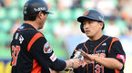 [OSEN=인천, 이대선 기자] 23일 오후 인천 문학야구장에서 열린 2013 한국야쿠르트 세븐프로야구 SK 와이번스와 롯데 자이언츠의 경기, 6회초 1사 만루에서 롯데 손아섭이 좌전 적시타를 치고 김응국 코치에게 팔꿈치 보호대를 건네