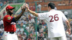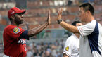 [OSEN=문학, 곽영래 기자] 3일 오후 인천 문학야구장에서 열린 '2013 한국야쿠르트 세븐프로야구' SK 와이번스와 KIA 타이거즈의 경기, 5회말 KIA 소사가 수비를 마치고 더그아웃으로 들어오면서 서재응과 하이파이브를 하고 있다. SK