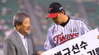 [OSEN=잠실,박준형 기자] 23일 오후 서울 잠실구장에서 열린 2013 한국야쿠르트 세븐프로야구 LG 트윈스와 KIA 타이거즈의 경기, 5회말 종료 후 클리닝 타임때 LG 이병규가 사이클링, 10연타석 안타 신기록 시상식을 갖고 KBO 구본능 총