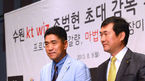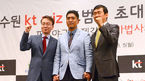 [OSEN=수원,박준형 기자] 5일 오전 경기도 수원 라마다 프라자 호텔 3층 그랜드볼룸에서 열린 수원 KT wiz 조범현 초대 감독의 기자회견에서 조범현 감독이 KT 권사일 사장, 주영범 단장과 포즈를 취하고 있다 조범현 신임 감독은
