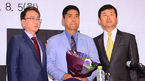[OSEN=수원,박준형 기자] 5일 오전 경기도 수원 라마다 프라자 호텔 3층 그랜드볼룸에서 열린 수원 KT wiz 조범현 초대 감독의 기자회견에서 조범현 감독이 KT 권사일 사장, 주영범 단장과 함께 포즈를 취하고 있다 조범현 신임 감