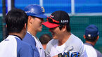 [OSEN=창원,박준형 기자] 6일 오후 경남 창원 마산구장에서 열린 '2013 한국야쿠르트 세븐 프로야구' NC 다이노스와 LG 트윈스의 경기에 앞서 NC 김경문 감독이 LG 김용의와 이야기를 나누고 있다 이날 경기에서 NC와 LG는 에릭과 신재