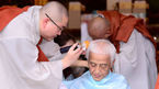 [OSEN=박준형 기자] 16일 오전 서울 종로구 견지동 조계사 일주문에서 진행된 연극 ' 그것은 목탁구멍 속의 작은 어둠이었습니다' 삭발식에서 출연배우들이 삭발을 하고 있다. 극작가 이만희와 연출가 강영걸이 만든 첫 번째 히트
