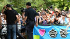 [OSEN=춘천, 이대선 기자] 27일 오후 배우 송중기가 강원도 춘천 102보충대를 통해 현역 입대했다. 배우 송중기의 일본팬들이 응원 문구가 적힌 부채를 들고 기다리고 있다. 송중기는 이날 보충대에 도착, 정문 앞에서 입대 현장을