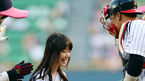 [OSEN=잠실, 백승철 기자] 28일 오후 서울 잠실구장에서 열린 '2013 한국야쿠르트 세븐 프로야구' LG 트윈스와 넥센 히어로즈의 경기 시작 전 시구를 마친 이정현이 윤요섭으로부터 시구공을 받고 있다. LG가 에이스투수 레다메스