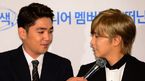 [OSEN=지형준 기자] '슈퍼주니어의 익스피리언스 코리아 NEWS+Seoul' 출간 기념 기자간담회가 11일 오후 서울 영등포 타임스퀘어의 한 카페에서 열렸다. 강인과 성민이 마이크로 장난을 치고 있다. '슈퍼주니어의 익스피리언스 코리