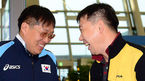 [OSEN=인천국제공항, 곽영래 기자] 한국 여자배구대표팀이 태국에서 열리는 제17회 아시아여자배구선수권대회 참가를 위해 인천국제공항을 통해 태국으로 출국했다. 현대건설 황현주 감독이 김수지와 이야기를 나누고 있다. 201
