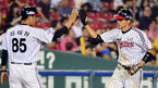 [OSEN=대구, 이대선 기자] 13일 오후 대구시민운동장 야구장에서 열린 2013 한국야쿠르트 세븐프로야구 삼성 라이온즈와 롯데 자이언츠의 경기, 2회초 2사 2루에서 롯데 강민호가 좌월 투런 홈런을 치고 3루에서 박현승 코치와 하이