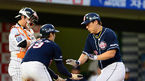 [OSEN=부산, 이대선 기자] 14일 오후 부산 사직야구장에서 열린 롯데 자이언츠와 두산 베어스의 경기, 5회초 1사 2루에서 두산 홍성흔이 우월 투런 홈런을 친 김현수를 축하하고 있다. 두산 베어스는 외국인 우완 데릭 핸킨스를 롯