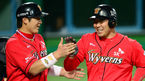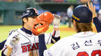 [OSEN=잠실, 이대선 기자] 21일 오후 서울 잠실야구장에서 열린 2013 한국야쿠르트 세븐프로야구 두산 베어스와 KIA 타이거즈의 경기, 7회말 2사 1,2루에서 두산 이원석이 좌월 스리런 홈런을 치고 덕아웃에서 김선우와 하이파이브