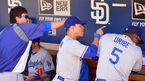[OSEN=샌디에이고, 민경훈 기자] 23일 (이하 한국시간) 미국 캘리포니아 샌디에이고 펫코 파크에서 열린 2013 메이저리그 샌디에이고 파드리스와 LA 다저스 경기, 경기 전 다저스 덕아웃에서 류현진과 덕아웃에서 동료들과 즐겁게