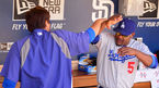 [OSEN=샌디에이고, 민경훈 기자] 23일 (이하 한국시간) 미국 캘리포니아 샌디에이고 펫코 파크에서 열린 2013 메이저리그 샌디에이고 파드리스와 LA 다저스 경기, 경기 전 다저스 덕아웃에서 류현진과 트레이 힐만 코치와 악수와 함