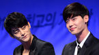 [OSEN=이대선 기자] 30일 오전 서울 신사동 CGV 압구정에서 영화 '노브레싱'(감독 조용선) 제작보고회가 열렸다. 배우 서인국과 이종석이 취재진의 질문을 듣고 있다. 영화 '노브레싱'은 한국 영화 최초 '수영'이란 소재를 통해 국