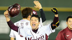 [OSEN=목동, 곽영래 기자] 8일 오후 서울 목동구장에서 열린 '2013 한국야쿠르트 세븐 프로야구' 포스트시즌 넥센 히어로즈와 두산 베어스의 준플레이오프 1차전 경기 9회말 2사 2,3루 이택근이 끝내기 안타를 치고 환호하며 손승락