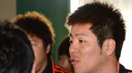 [OSEN=부산, 이대선 기자] 1일 오전 사직야구장 4층 강당에서 롯데 자이언츠 2013시즌 납회 행사가 열렸다. 롯데 강민호가 동료들과 인사를 나누고 있다. 납회 행사에서는 구단 MVP, 우수선수, 공로상(선수/프런트) 부문에 대한 시상
