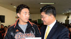 [OSEN=부산, 이대선 기자] 1일 오전 사직야구장 4층 강당에서 롯데 자이언츠 2013시즌 납회 행사가 열렸다. 심수창이 새로운 선수소개 때 인사를 하고 있다. 납회 행사에서는 구단 MVP, 우수선수, 공로상(선수/프런트) 부문에 대한 시