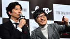 [OSEN=박준형 기자] 9일 오후 서울 왕십리 CGV에서 진행된 영화 '용의자'(감독 원신연) 언론시사회에서 배우 박희순이 공유에게 질문 취재기자를 향해 손가락을 가르켜 보이고 있다 영화 '용의자'는 조국에게 버림받고 가족까지