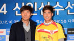 [OSEN=백승철 기자] 10일 오후 서울 신문로 축구회관에서 열린 2014년도 K리그 신인선수 지명 드래프트에서 광주 남기일 감독대행과 권수현이 기념촬영을 하고 있다. 이날 드래프트 지명 순서는 K리그 클래식(1부) 구단이 1순위, K