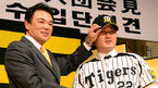 [OSEN=오사카, 정송이 기자] 13일 오후 일본 오사카 리츠칼튼 호텔에서 진행된 '오승환 한신 타이거스 입단 기자회견'에서 와다 유타카 감독과 오승환이 포토타임을 갖고 있다. 한국 최고의 마무리투수로 이름을 날렸던 오승환은