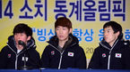 [OSEN=박준형 기자] 15일 오후 서울 태릉선수촌 국제스케이트장에서 진행된 '2014 소치 동계올림픽' 빙상국가대표선수단 미디어 데이 행사에서 쇼트트랙 남자팀 신다운과 이한빈, 박세영이 소감을 말하고 있다 이번 대회에서도 한