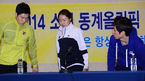 [OSEN=박준형 기자] 15일 오후 서울 태릉선수촌 국제스케이트장 내 기자회견장에 열린 '2014 소치 동계올림픽' 빙상국가대표선수단 미디어 데이 행사에서 모태범과 이상화, 이승훈이 입장하고 있다 이번 대회에서도 한국 선수단