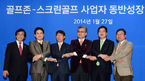 [OSEN=지형준 기자] 토털골프문화기업 골프존이 27일 오전 서울 여의도 CCMM빌딩에서 스크린 골프장 사업주들과의 동반성장 방안을 발표했다. 새누리당 이완영 의원, 권유식 사업주 대표, 골프존 장성원 전무, 한국시뮬레이션골프