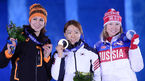 [OSEN=소치(러시아), 박준형 기자] 여자 빙상 500m에서 올림픽 2연패의 위업을 달성한 '빙속여제' 이상화 시상식이 13일(한국시간) 러시아 소치 올림픽파크에서 열렸다. 금메달을 차지한 이상화가 올카 파트쿨리나, 마고 보어와 포