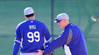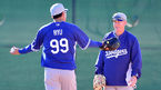 [OSEN=글렌데일(애리조나), 이대선 기자] 14일(한국시간) 미국 애리조나주 글렌데일 캐멀벡랜치에서 메이저리그 LA다저스의 스프링 트레이닝이 진행됐다. 다저스 류현진이 훈련 중 코치와 인사를 나누고 있다. 다저스 투수와 포수